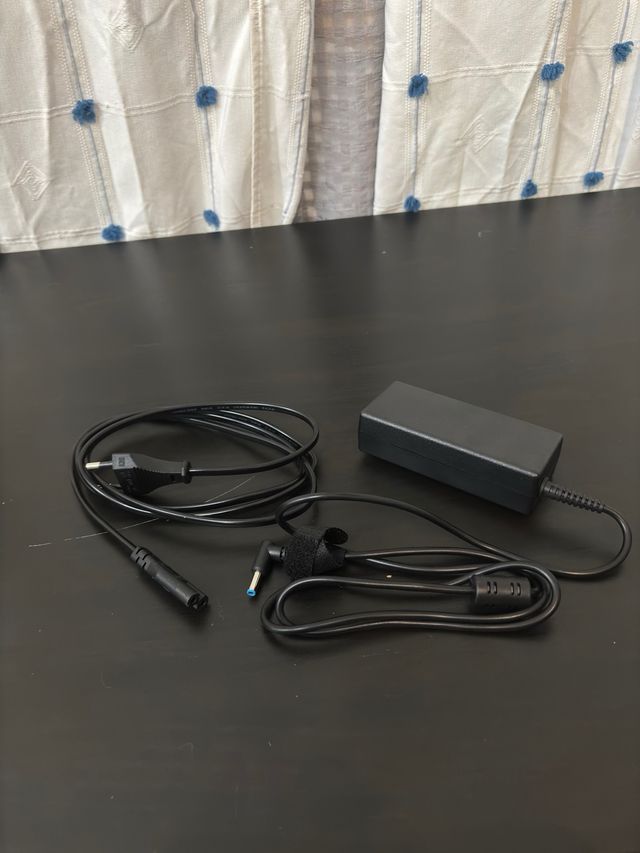 Adaptador de corriente para portátil, ideal para cargar tu dispositivo. - Cable de alimentación incluido. - Conector de salida azul.