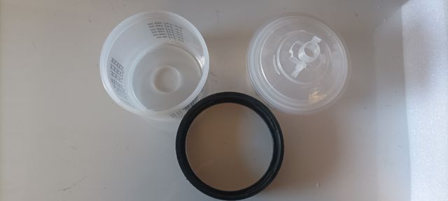 Detalles del productoAdaptador de pintura para pistola, compuesto por un vaso medidor, una tapa y un anillo.