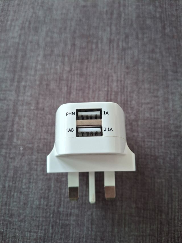 Detalles del productoAdaptador para enchufe en UK, Reino Unido, Inglaterra. 2 puertos USB, para cable de teléfono y tableta, tablet. Nuevo, utilizado en un viaje.