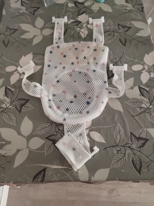Detalles del productoAdaptador de malla para bañera de bebé, con un diseño de estrellas en tonos rosas y azules.