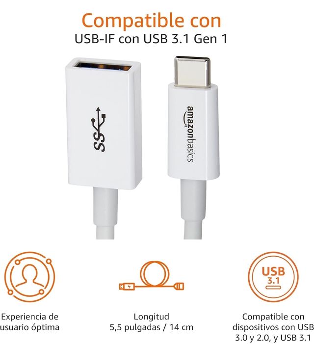 Cable adaptador convertidor hembra de USB-C a USB-A 3.1, 1.ª gen., 5 GB/s, alta velocidad, certificado USB-IF, para portátiles, tablets y teléfonos, color blanco.