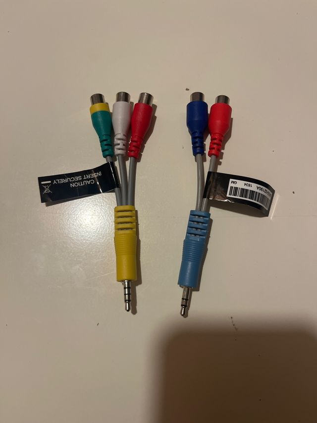 - Incluye cables con conectores RCA (verde, blanco, rojo, azul, rojo) y un extremo con jack de 3.5mm.