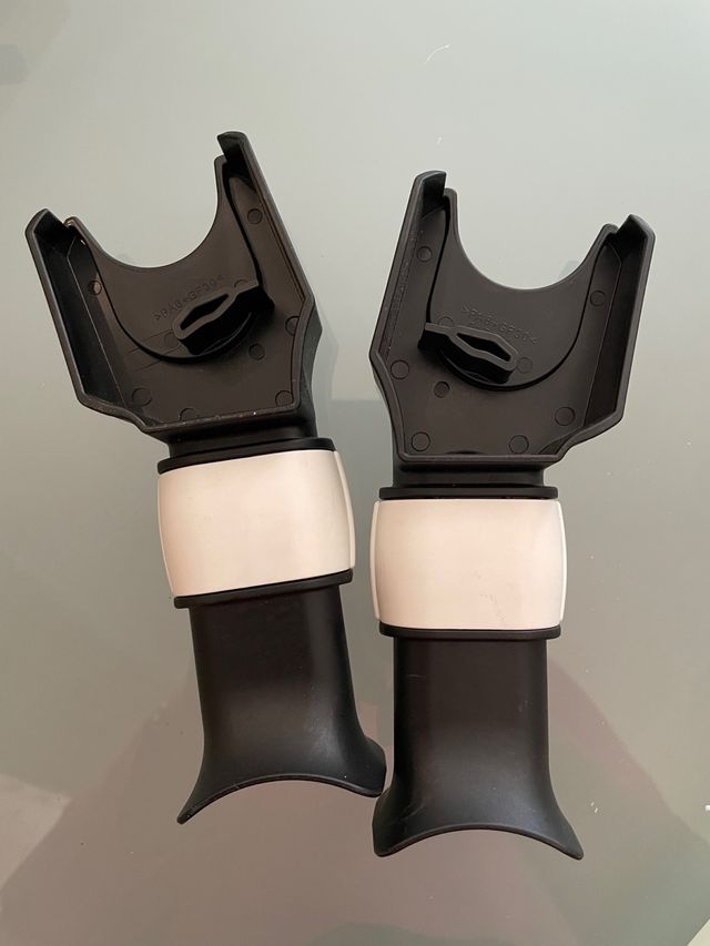 Adaptadores para acoplar sillas de coche Maxi Cosi a carritos Bugaboo. - Material: Plástico resistente. - Color: Negro y blanco.