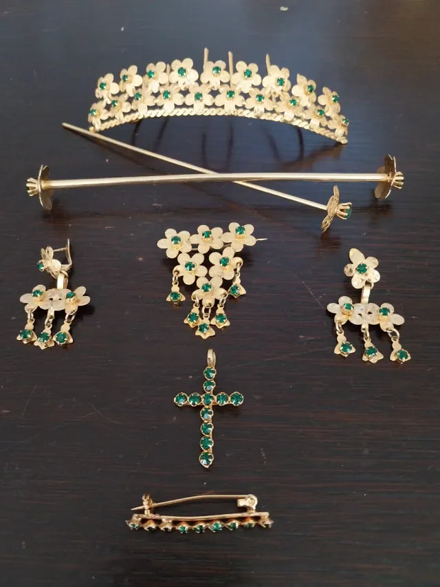 Conjunto de aderezo tradicional castellonero para niña pequeña - Solo conservo 3 agujas - Diseño floral con detalles en pedrería verde.