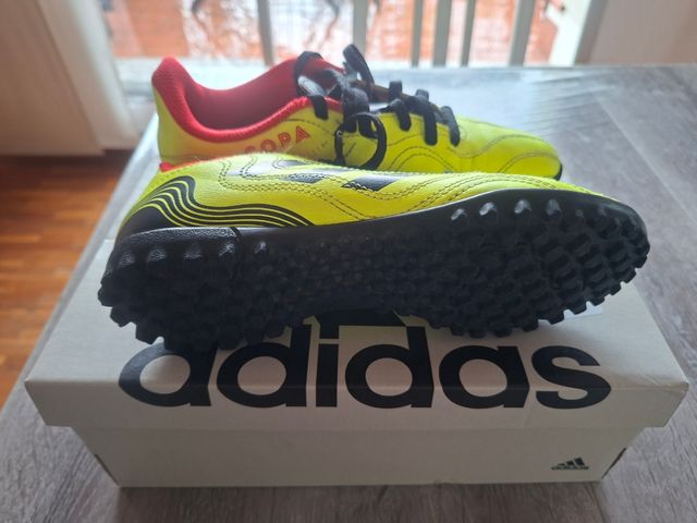 Detalles del productoBotas de fútbol Adidas Copa para niño, en color amarillo neón y detalles negros. Ideales para jugar en campos de césped artificial.