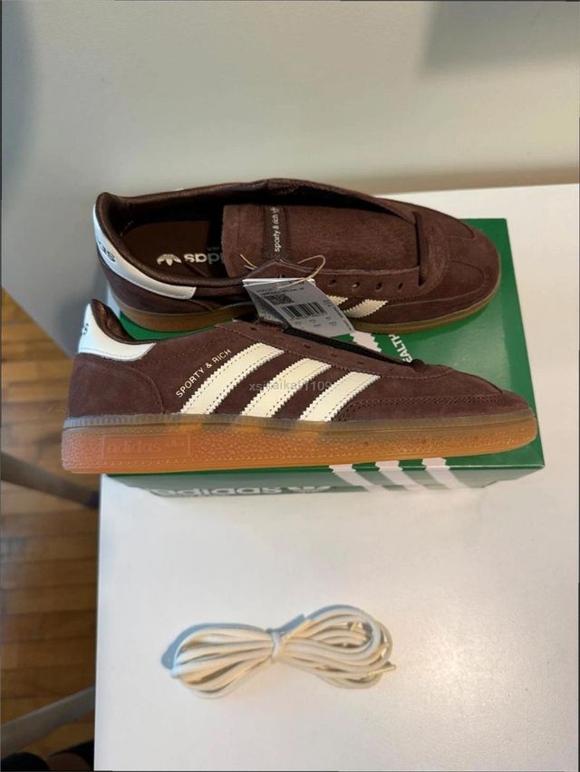 Zapatillas Adidas Handball Spezial en ante marrón y detalles blancos. Incluyen cordones adicionales.