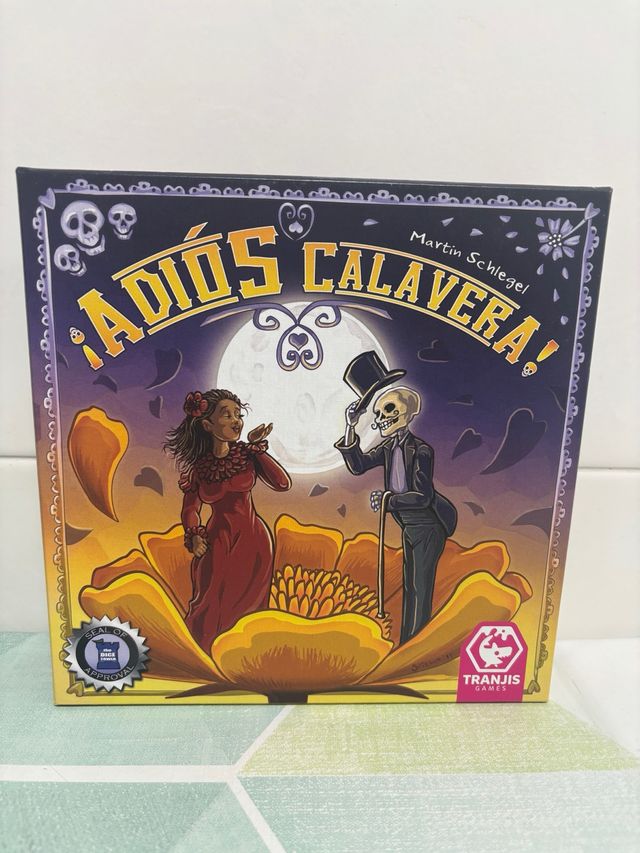 Juego de mesa Adiós Calavera. - Ilustración temática de calaveras y flores. - Diseño de Martin Schlegel. - Incluye sello de aprobación de Dice Tower.