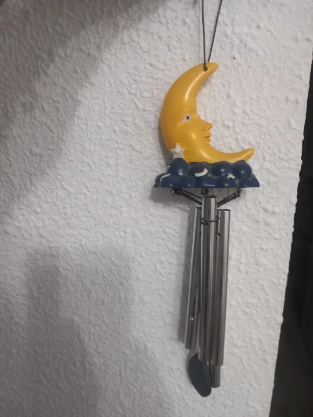 Adorno colgante con diseño de luna sonriente y nubes.para encima de la puerta - Figura de luna amarilla con rostro. - Base con nubes azules y estrellas. - Tubos metálicos para sonido.