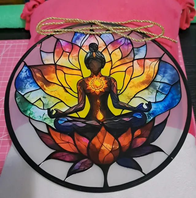 Detalles del productoEste adorno colgante presenta un diseño de mandala con una figura de yoga en meditación.