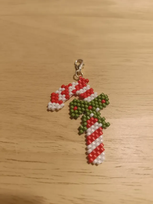 Detalles del productoAdorno navideño con forma de bastón de caramelo, elaborado a mano con cuentas.