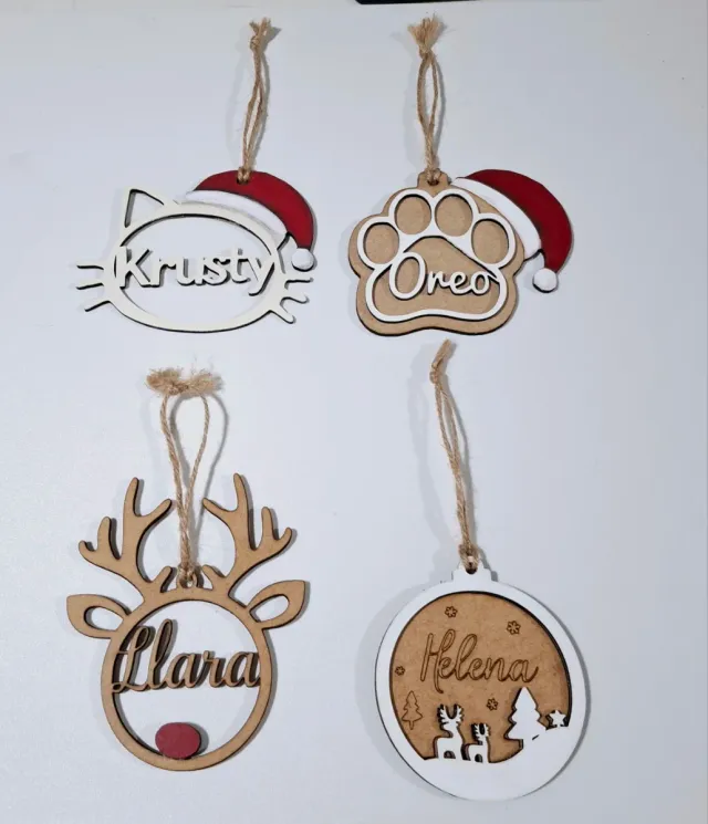 Detalles del productoConjunto de adornos navideños de madera, personalizados con el nombre. Elije el diseño y lo personalizamos para tí.
