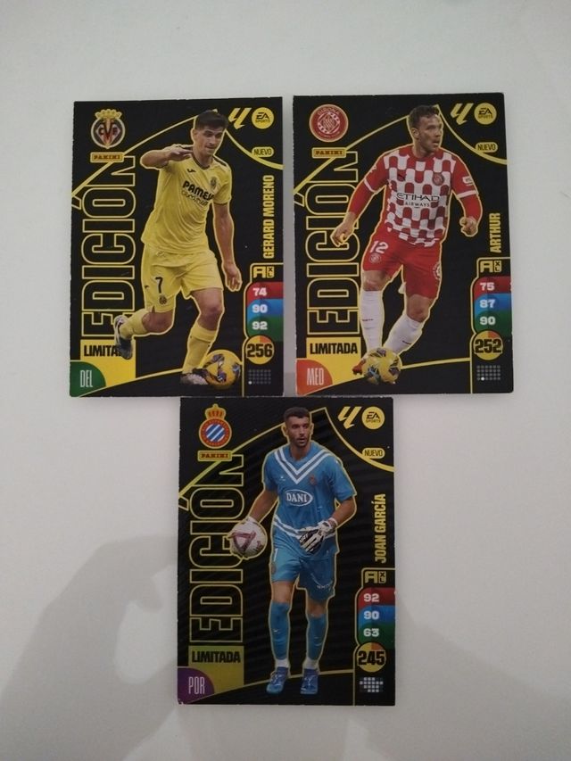 Detalles del productoTres cartas de la colección Adrenalyn 2024-25 en perfecto estado. Son cartas limitadas de Gerard Moreno, Arthur y Joan García. - Incluye tres cromos de jugadores. - Cartas en excelente estado. - Edición limitada.