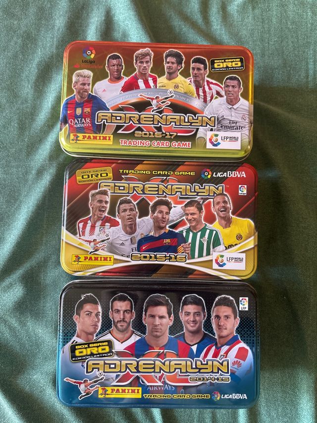 Detalles del productoTres cajas metálicas de cromos Adrenalyn en buen estado incluyen cromos de cada coleccion. Ideales para coleccionistas.