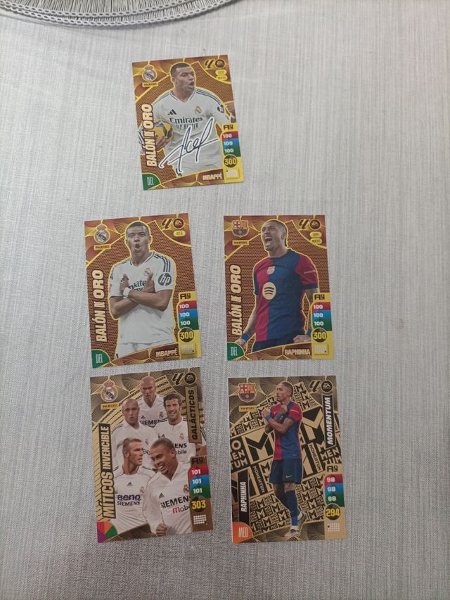 Detalles del productoSe venden 5 cartas de la colección Adrenalyn XL. Las cartas son de la temática Balón Oro y Galácticos. Incluyen una carta firmada de Mbappé. Están en muy buen estado. - 2 cartas Balón Oro de Mbappé (Real Madrid). - 1 carta Balón Oro de otro jugador del Real Madrid. - 1 carta Balón Oro de un jugador del FC Barcelona. - 1 carta Galácticos del Real Madrid.