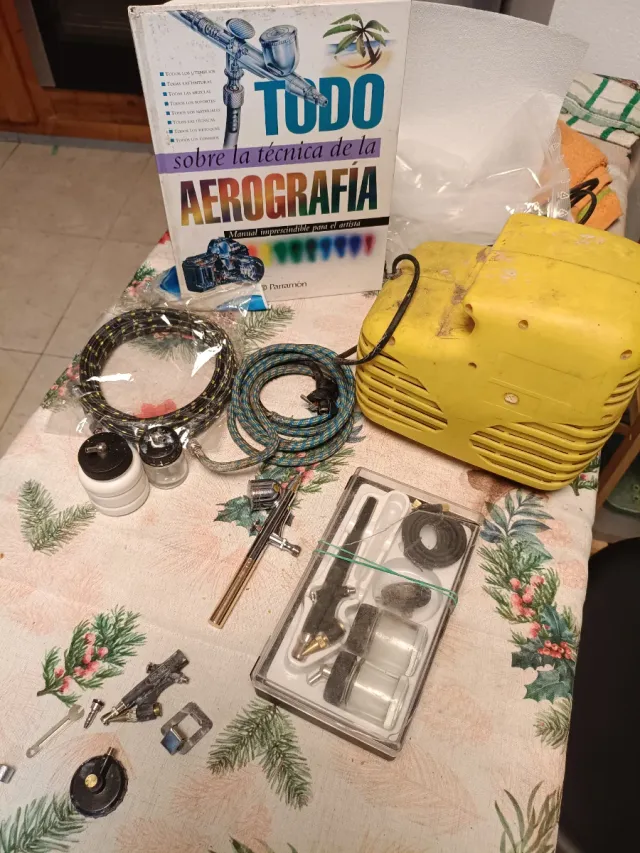 Detalles del productoLote de aerografía que incluye un compresor, aerógrafos, recambios y un libro.
