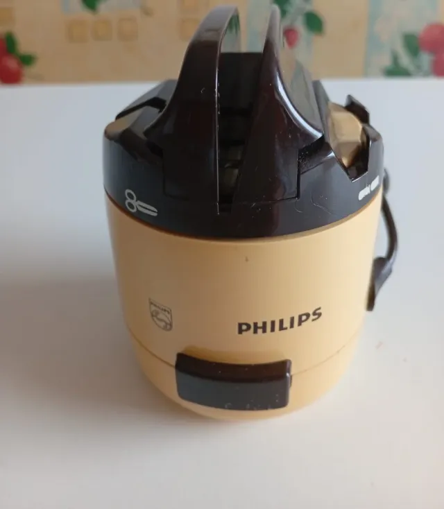 Afilador eléctrico de la marca Philips. - Diseño compacto y funcional. - Color beige y marrón.