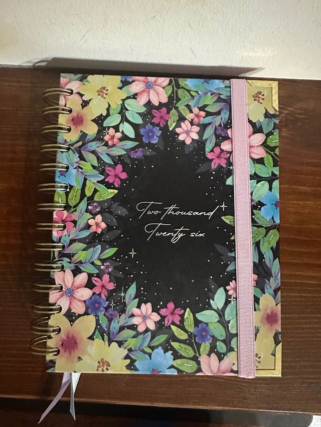Detalles del productoAgenda de tapa dura con un diseño floral vibrante sobre fondo negro. Perfecta para organizar tu año 2026.