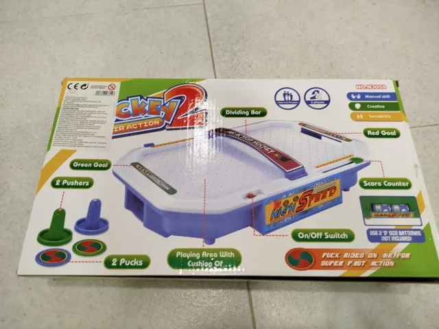 Juego de mesa Air Hockey 2. - Incluye 2 empujadores y 2 discos. - Marcador de puntos. - Barra divisoria. - Funciona con pilas (no incluidas).
