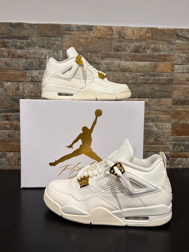 AIR JORDAN 4 RETRO en dorado metalizado de mujer talla 41. Los Jordan 4 Retro en dorado metalizado (de mujer) presentan el esquema de colores en blanco roto de los Jordan 4 Retro y actualizan la reconocible silueta con detalles en dorado. 100% originales, se envían en su caja original. Escríbeme si necesitas más fotos, precio negociable