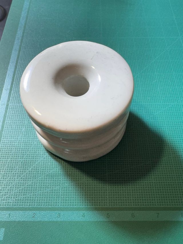 Aislador cerámico de color blanco con un diseño acanalado. - Material: Cerámica. - Color: Blanco. - Diseño: Acanalado.