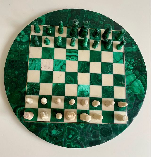 Detalles del productoJuego de ajedrez antiguo de malaquita y mármol. El tablero es circular, de 24cm. de diámetro, diseño de casillas y borde dorado alrededor de la zona de juego.Esta muy bien mantenido,tiene algún pequeño desconchón en el borde que puede apreciarse en foto.
