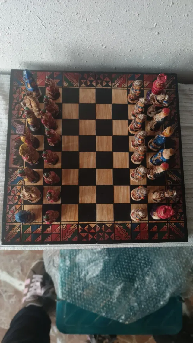 Detalles del productoSet de ajedrez con tablero y piezas de cerámica, con un diseño artesanal inspirado en motivos culturales.