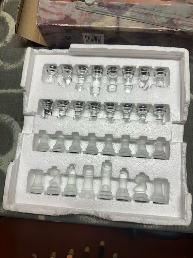 Detalles del productoElegante juego de ajedrez con piezas de cristal transparente y esmerilado. Perfecto para coleccionistas o como pieza decorativa.