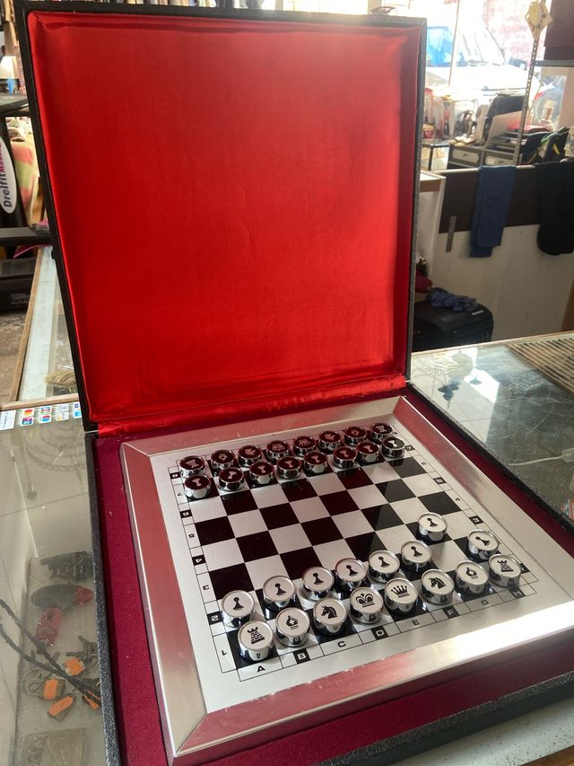 - Piezas de ajedrez con acabado plateado y detalles en negro.