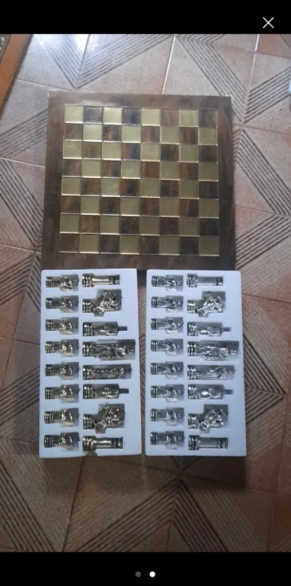 Detalles del productoTablero de ajedrez con casillas doradas y piezas de metal.Precio negociable
