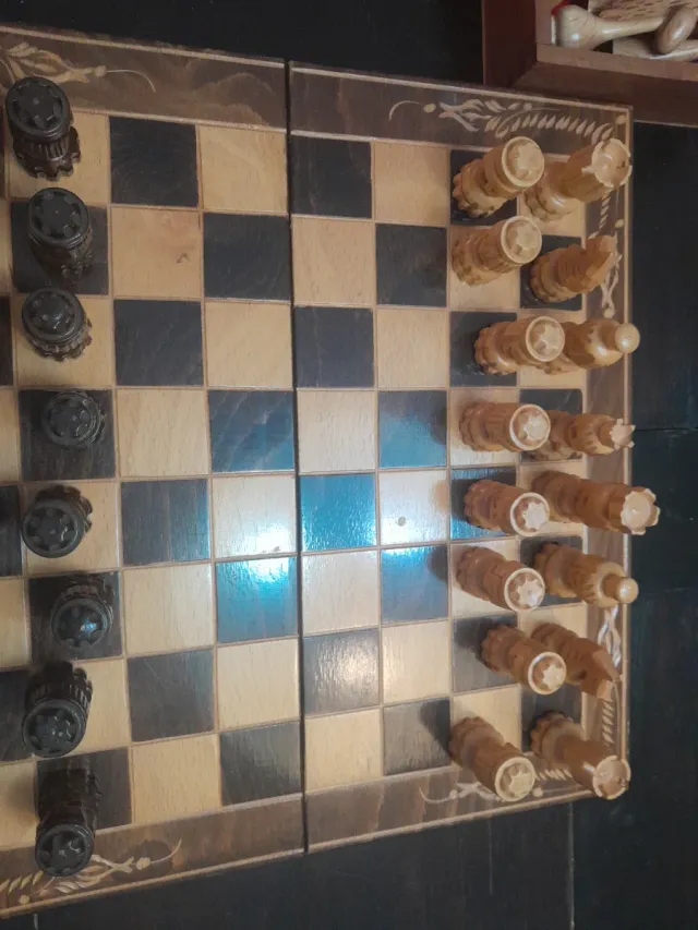 Detalles del productoTablero de ajedrez con un diseño inspirado en el antiguo Egipto. Las piezas son de madera, con un acabado detallado.