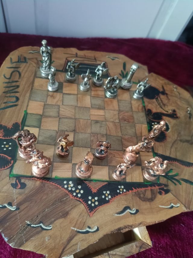 Detalles del productoPrecioso ajedrez de Túnez, hecho a mano. El tablero es de madera de olivo con detalles pintados a mano, y las piezas son de metal. Es un artículo único y artesanal, ideal para coleccionistas o amantes del ajedrez.