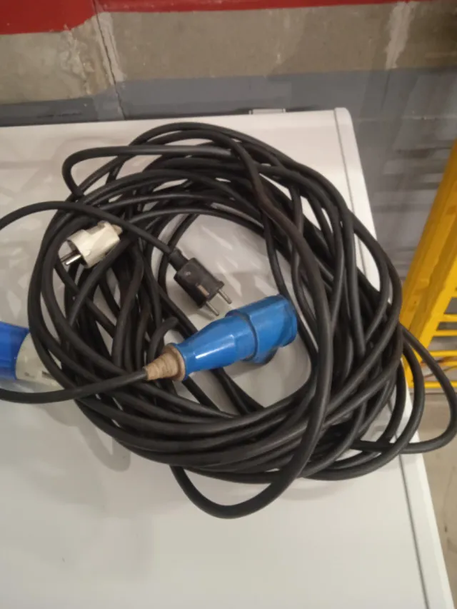 Cable alargador de 25 metros de longitud con un grosor de 1.5 mm. - Longitud: 25 metros. - Grosor del cable: 1.5 mm. - Conector azul y blanco.