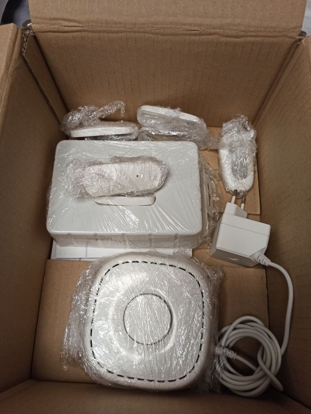 Alarma doméstica. Compuesta por mando, central y 4 sensores de puerta o ventana (dos de ellos sin estrenar). Funciona perfectamente. Wifi
