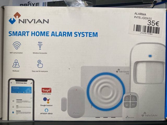 Detalles del productoSistema de alarma para casa inteligente NIVIAN, nuevo. Funciona con WiFi y es compatible con Google Assistant y Alexa. Incluye 2 sensores inalámbricos y mando a distancia. Fácil de usar para cualquier persona. - Comunicación WiFi.