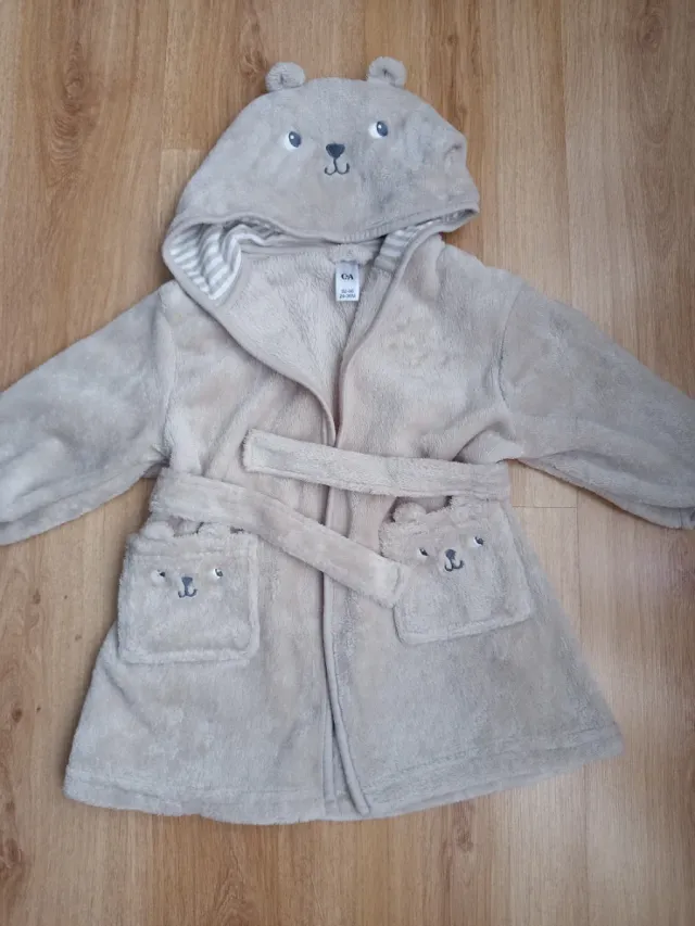 Albornoz suave y cómodo para bebé con diseño de oso. - Capucha con orejitas. - Bolsillos delanteros con cara de oso. - Cinturón para ajustar.