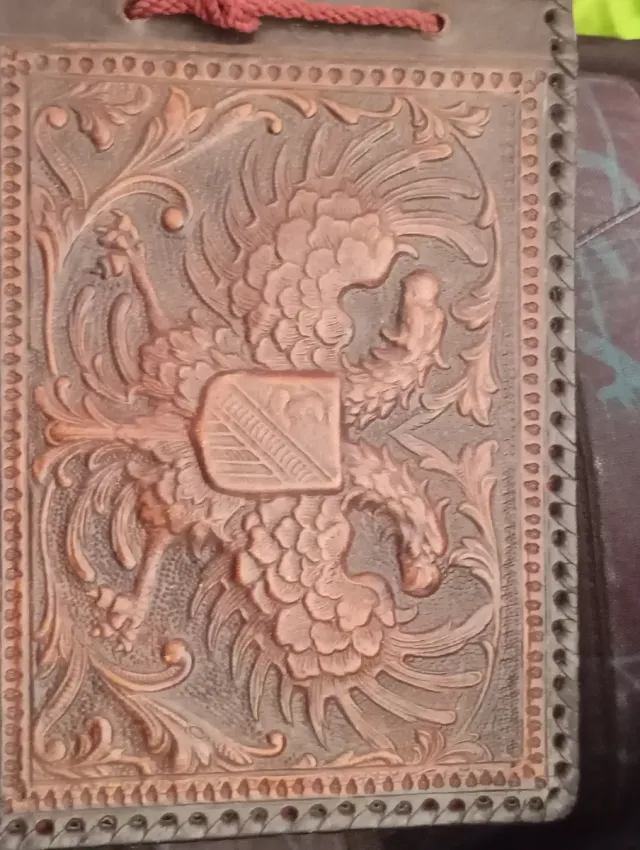 Detalles del productoÁlbum antiguo con un diseño grabado en relieve. Presenta un águila bicéfala con un escudo en el centro, rodeado de motivos florales.