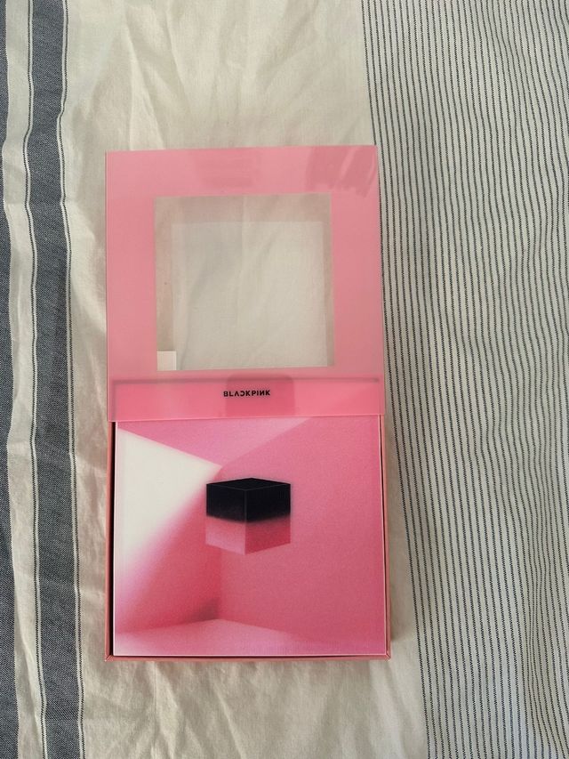 Álbum de BLACKPINK con un diseño moderno y llamativo. - Portada con arte abstracto en tonos rosas. - Detalle de logo de BLACKPINK.
