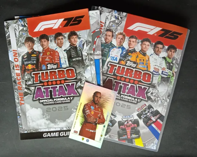 Detalles del productoÁlbum completo 324 cartas,tarjetas o cromos básicos y brillantes de la colección turbo attax f1 2025 75 aniversario marca topps.En perfecto estado.Incluye guia,tablero y card xl.No incluye signature style y diamond pull.