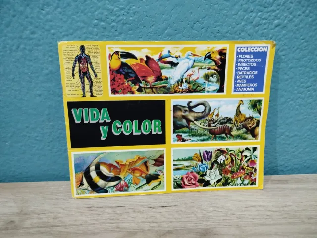 Detalles del productoÁlbum de cromos Vida y Color con temática de naturaleza y anatomía. Contiene imágenes de animales, flores y el cuerpo humano.