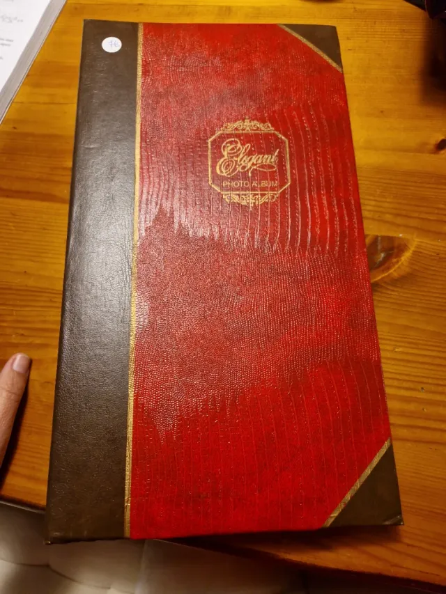 Elegante álbum de fotos con capacidad para 300 fotografías de tamaño 10x15 cm. - Cubierta de color rojo con textura. - Detalles dorados en las esquinas y el lomo.