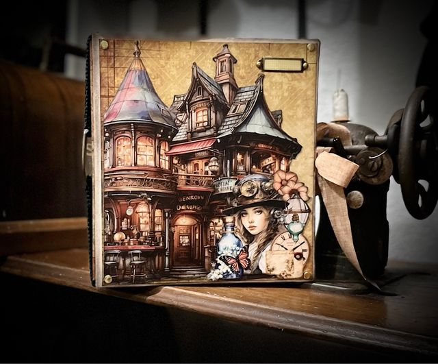 Detalles del productoÁlbum de fotos artesanal con un diseño steampunk.