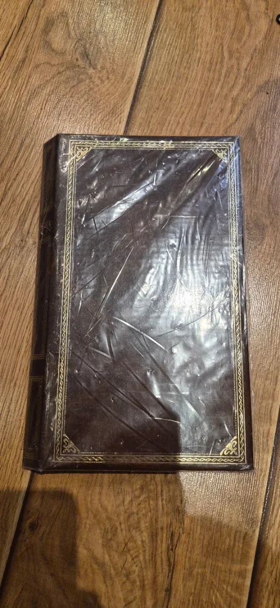 Detalles del productoÁlbum de fotos con una cubierta de color marrón oscuro y un borde decorativo dorado.