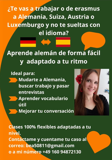 Detalles del producto¡Hola! Mi nombre es Beatriz y quiero ser tu profe particular de Alemán. He estado viviendo los últimos 9 años en Alemania, Austria y la frontera de Holanda con Alemania, aprendiendo los diferentes tipos de vida y cultura y las formas de hablar y de pensar de sus gentes. Mi forma de enseñar Alemán es práctica y dinámica, me adapto a cada alumno según su nivel. Principalmente, lo hago de forma on-line, soy flexible, podemos dar las clases conforme a tus necesidades, las horas y los días de la semana los pones tú y los fijamos según los huecos que tengo. Normalmente me es fácil adaptarme.
