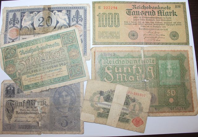 - Incluye billetes de 1000, 50, 10, 5 y 1 Marcos.