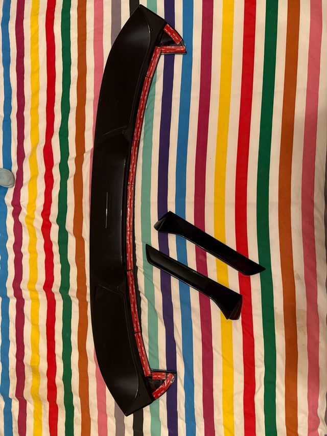 Conjunto de alerón y flaps para Seat Leon MK3. Piezas de color negro brillante con cinta adhesiva de doble cara. - Alerón trasero. - Dos flaps laterales.