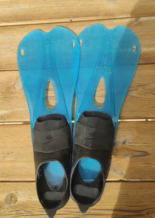Detalles del productoAletas de natación de color azul brillante, ideales para snorkel o buceo recreativo. Diseñadas para ofrecer comodidad y propulsión en el agua.