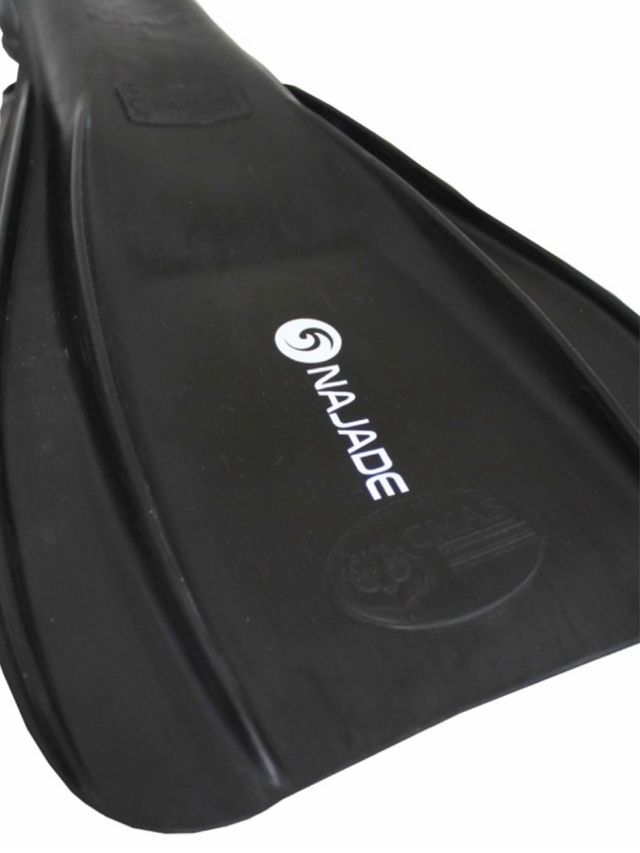 Aletas de natación de la marca Najade. Diseñadas para mejorar el rendimiento en el agua. - Color negro. - Logo de la marca visible.