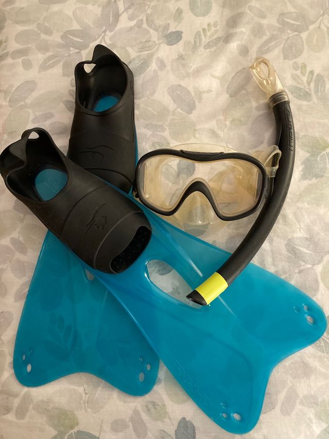 Aletas de natación usadas talla 33/34. Tubo y gafas de buceo marca Tribord Arañazos visibles en la parte de atrás, ver fotos.