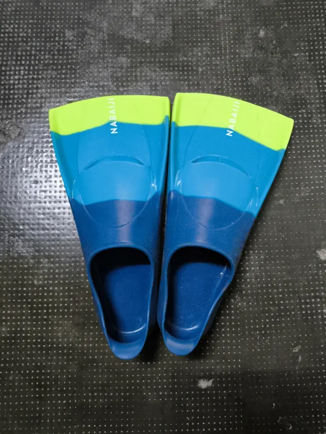 Aletas de natación para niños de la marca Nabaiji. Diseñadas para mejorar el desplazamiento en el agua. - Color azul y verde lima. - Diseño ergonómico.
