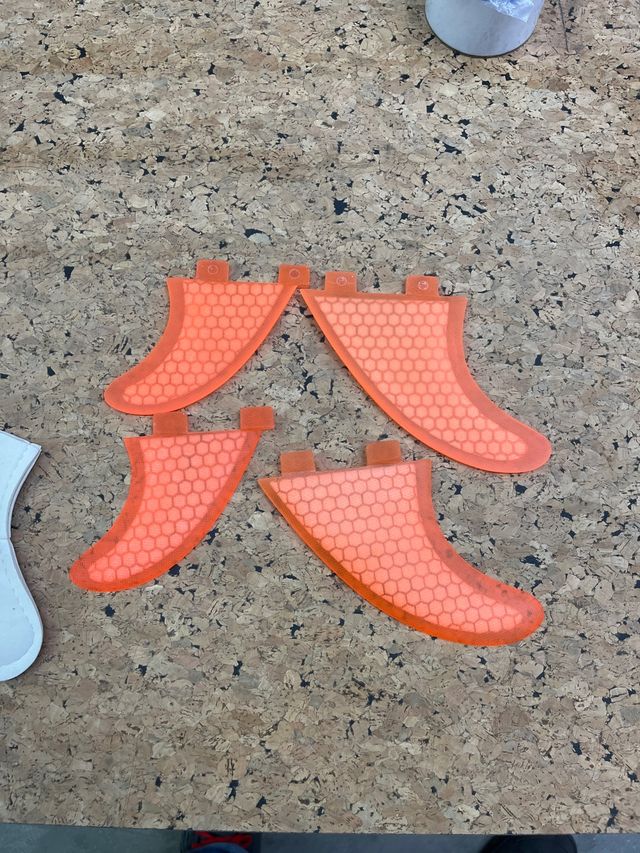 Detalles del productoSet de cuatro aletas de color naranja para tabla de surf. Tienen un diseño con patrón de panal.